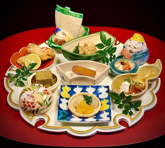 金縁雪輪盆に、初春らしい味わいを盛り込みました。