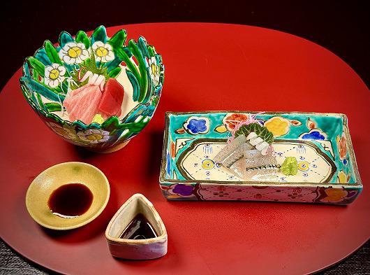 本鮪の器は、時期やバランスを考慮し、先月と同じ 水仙透鉢を使用します。
