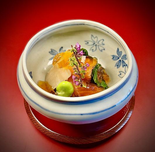 【 桜鱒 と 平貝 と しどけ の土佐酢ジェリーかけ 】